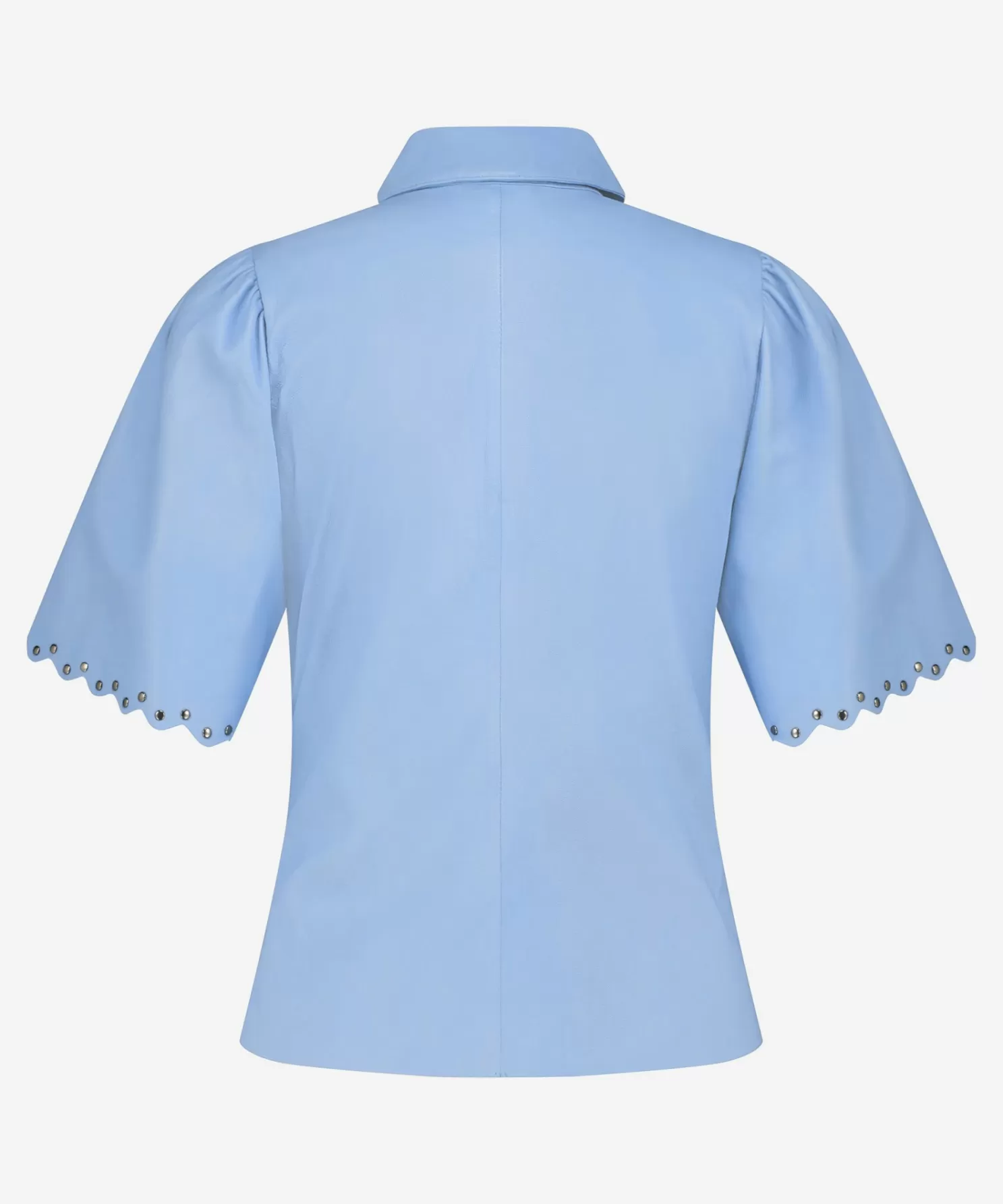 “Maak Kennis Met De Leren Tanra Top In De Kleur Airy Blue. De Blouse Heeft Een Regular Fit Pasvorm, Kan Aan De Voorzijde Gesloten Worden Door Drukknopen En Is Voorzien Van Unieke Details. De Opvallende Mouwen Bevatten Een Lichte Pof En Zijn Prachtig Afgewerkt Met Studs En Een Golvend Randje Aan De Onderkant. De Blouse In De Kleur Airy Blue Is Gemaakt Van Een Super Zachte Leerkwaliteit. “