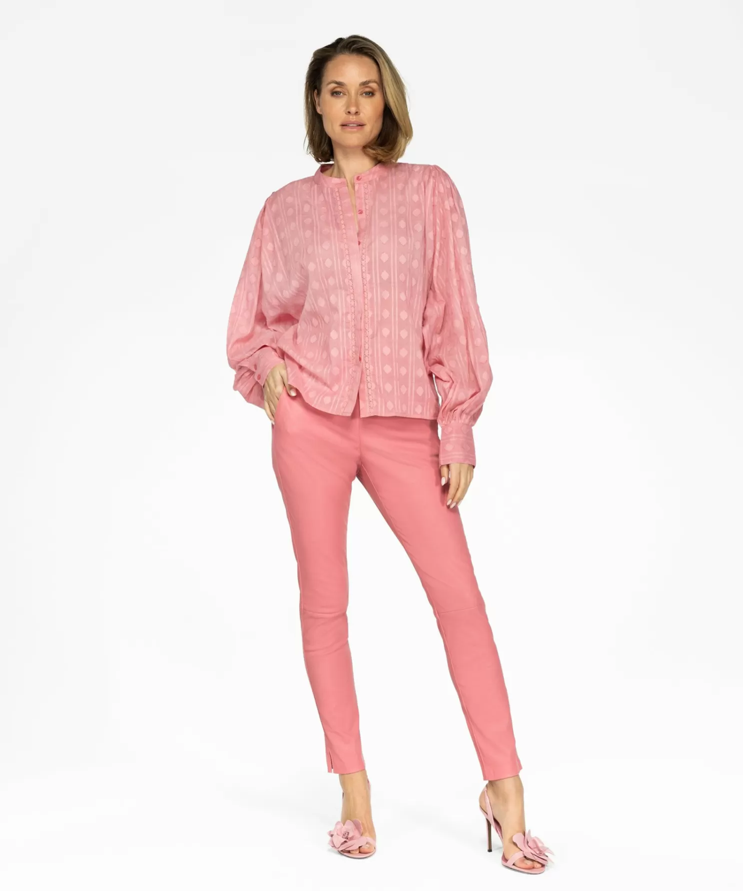 De Tarie Blouse In De Kleur Blush Is Vervaardigd Van 100% Katoen. Aan De Voorkant Heeft De Blouse Een Blinde Knoopsluiting Die Vanaf De Kraag Tot Onderaan Geopend Kan Worden. Wat Deze Top Uniek Maakt, Zijn De Geweven Details Over De Gehele Blouse. De Lange Mouwen Zijn Voorzien Van Manchetten. Combineer De Blouse Met Jeans En Sneakers Voor Een Casual Uitstraling Of Met Een Pantalon En Hakken Voor Een Meer Elegante Look.